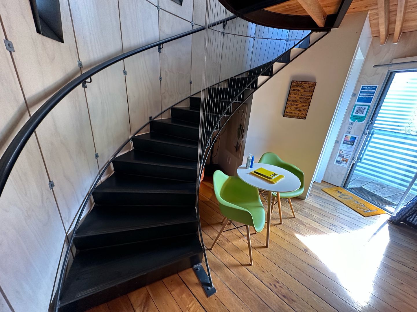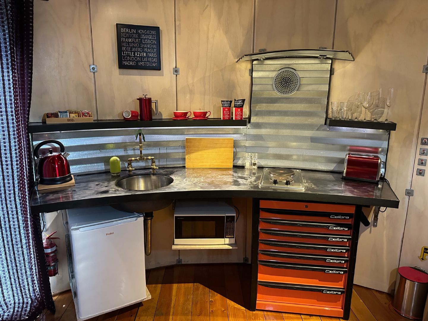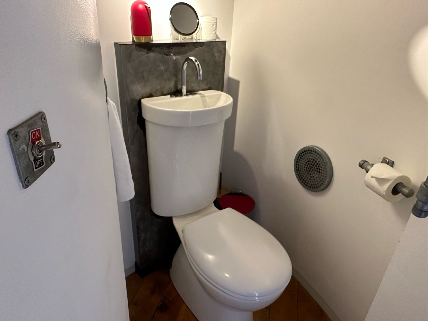 Navigate downstairs and you’ll find a compact yet charming kitchen space and a toilet area, where eco-friendly innovation allows for a simultaneous hand wash and toilet tank refill. Yes, you read that right.