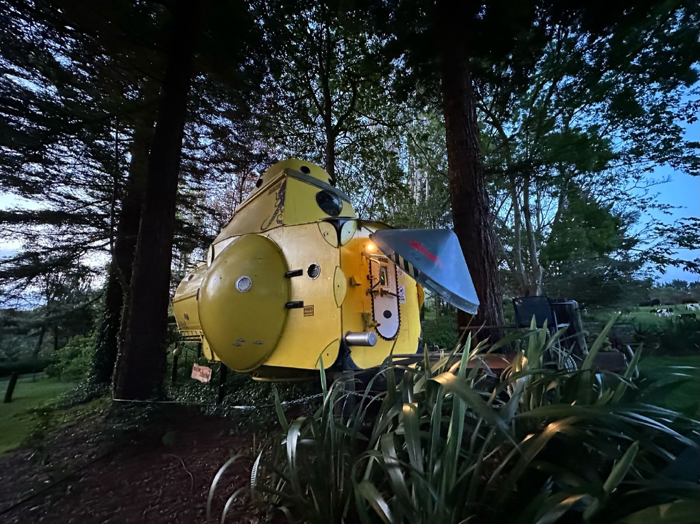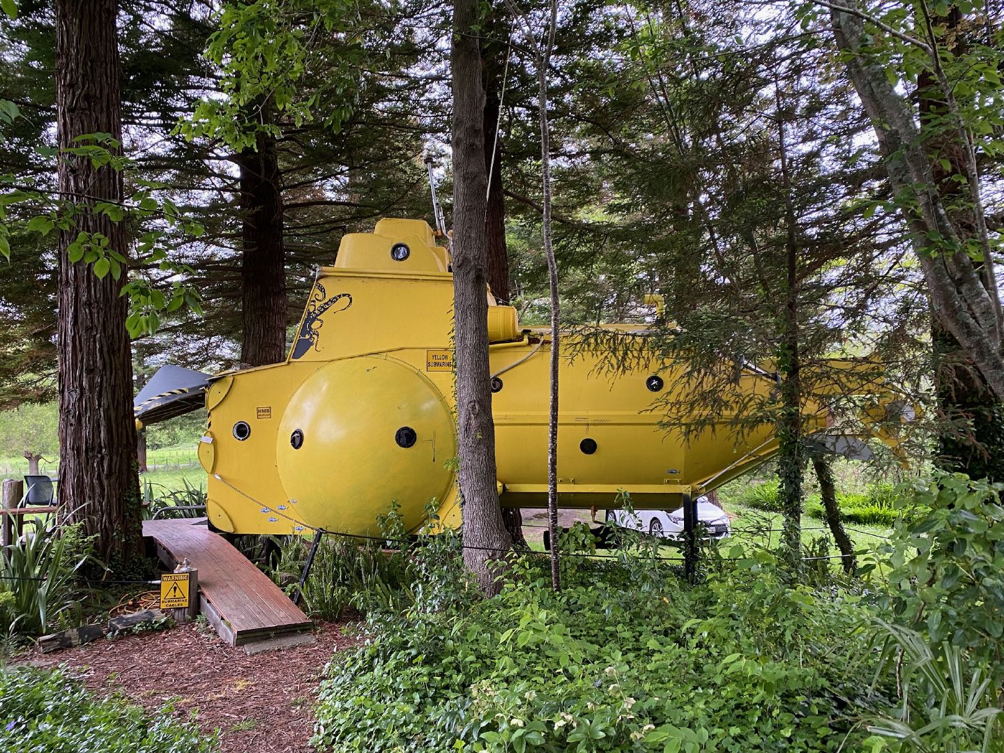 在高耸的红木树林中发现一处沉浸式的避世之所——一个黄色的潜水艇掩映在森林中。走过固定在陆地上的潜艇的操作舱口,进入一个非比寻常的入口。